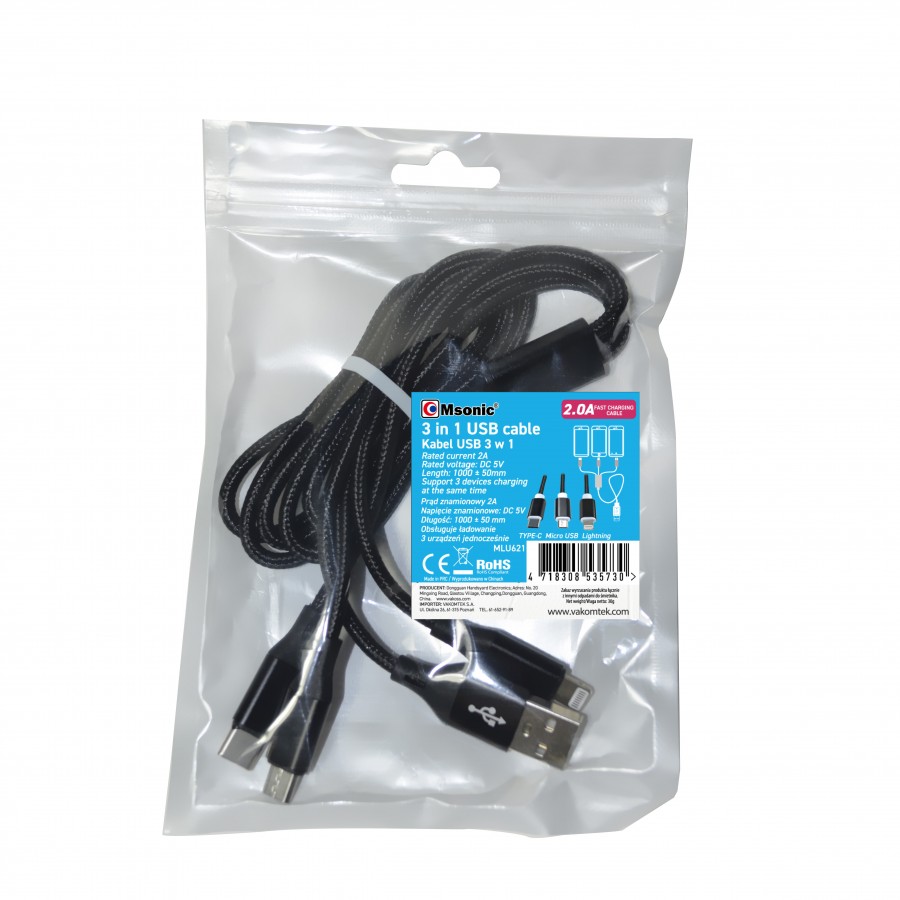 Szybki kabel Msonic MLU621 o długości 1metra posiada trzy końcówki do najpopularniejszych na rynku smartfonów. Kabel współpracuje z urządzeniami o interfejsie Micro USB, USB-C oraz Lightning (iPhone). Kabel MLU621 obsługuje szybkie ładowanie o natężeniu 2A. Specjalny nylonowy oplot zwiększa jego żywotność oraz zapobiega plątaniu.