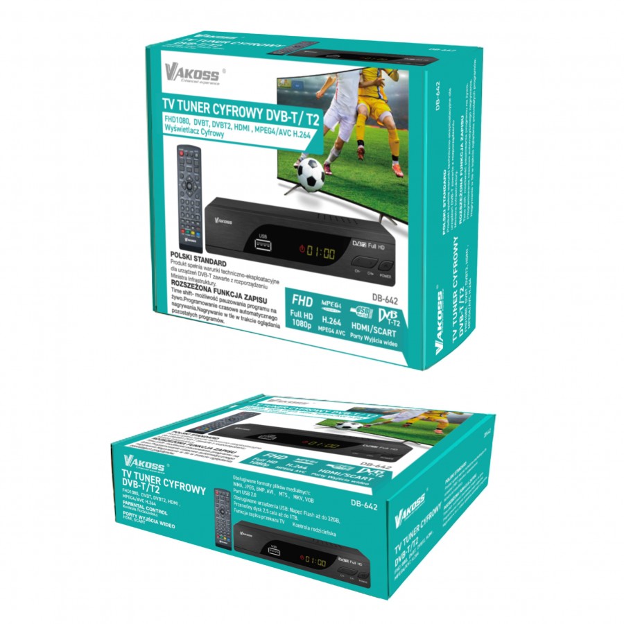 - DB-642 to dekoder naziemnej telewizji cyfrowej DVB-T/T2 z czytelnym cyfrowym wyświetlaczem. Umożliwia on odbiór naziemnej telewizji cyfrowej w rozdzielczości o standardzie MPEG-2 i MPEG-4. Dekoder Vakoss DB-642 posiada wbudowaną funkcję czasowego nagrywania, dzięki której nagrasz np. ulubiony serial o wybranej godzinie. Nagrywanie odbywa się w tle w trakcie oglądania innego programu. Funkcja Time shift umożliwia pauzowania programu na żywo. Wszystkie funkcje łatwo dostępne w Menu i bezpośrednio z funkcjonalnego pilota. Dekoder posiada wejście USB, które umożliwia podłączenie np pendrive lub zewnętrznego dysku. Posiada najbardziej popularne wejścia złącz SCART i HDMI, dzięki czemu będzie współpracował z większością telewizorów.