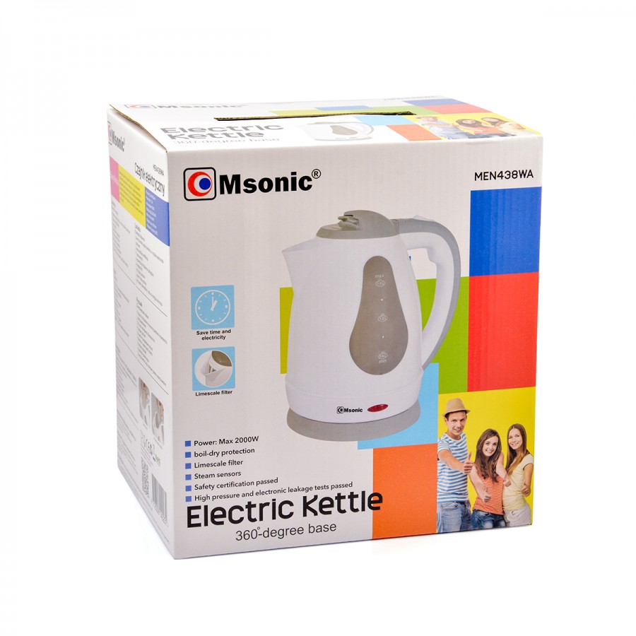- If you are looking for a cheap but modern and durable kettle - we have something for you! Kettle Msonic MEN438WA is made of high quality materials. It is equipped with a steam sensor that automatically switches off after boiling water. It has a convenient construction that allows you to pour water without leaking or splashing. It′s the perfect choice for you.