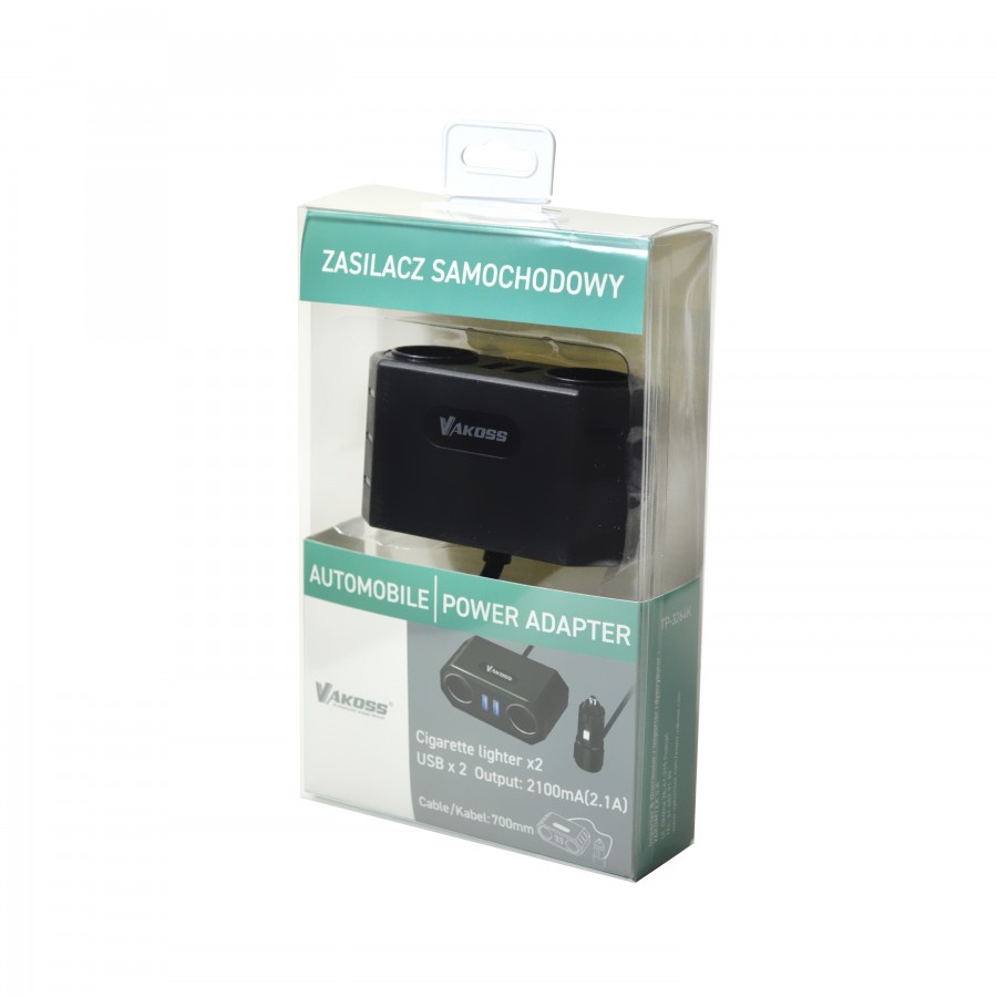 • Transformator samochodowy VAKOSS® wyposażono w 2 złącza USB oraz 2 gniazdka o wysokiej mocy. Nadaje się do podłączania notebooków, systemów GPS, przenośnych urządzeń internetowych, smartfonów, aparatów cyfrowych, tabletów, zestawów słuchawkowych Bluetooth, odtwarzaczy MP3/4 itp.