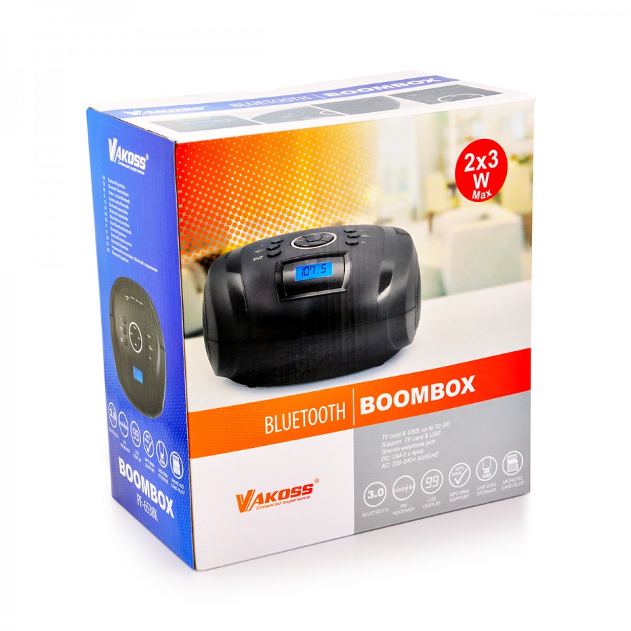 Boombox Vakoss PF-6538K jest idealnym urządzeniem dla osób chcących wykorzystać jego wyjątkową moc. To wysokiej jakości odtwarzacz z radiem stworzony do bezprzewodowego odtwarzania dźwięku z urządzeń wyposażonych w moduł Bluetooth, zarówno tabletów, smartfonów, odtwarzaczy mp3, czy laptopów. Jego spore rozmiary pozwalają cieszyć się czystym brzmieniem z mocnym i czystym basem.