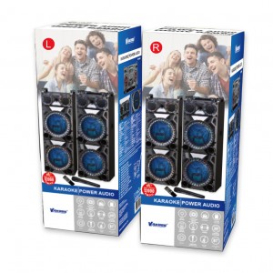 Zestaw dwóch kolumn Vakoss SP-2946BK to najlepsze połączenie stosunku jakości do ceny. Każda z kolumn została zaopatrzona w dwa 12” głośniki niskotonowe, oraz dwa głośniki wysokotonowe. Przekłada się to na dużą moc 240W zestawu. Kolumna centralna posiada panel sterownia z equalizerem, wejściem USB, SD, regulacją głośności, oraz m.in. przyciskami bass/treble, repeat. SP-2946BK został zaopatrzony w funkcję Bluetooth dzięki czemu można połączyć zestaw bezprzewodowo z telefonem. W zestawie znajduje się ponadto bezprzewodowy mikrofon, który przyda się w czasie karaoke. Dodatkowe efekty wizualne w postaci podświetlenia LED umilą każdą imprezę.