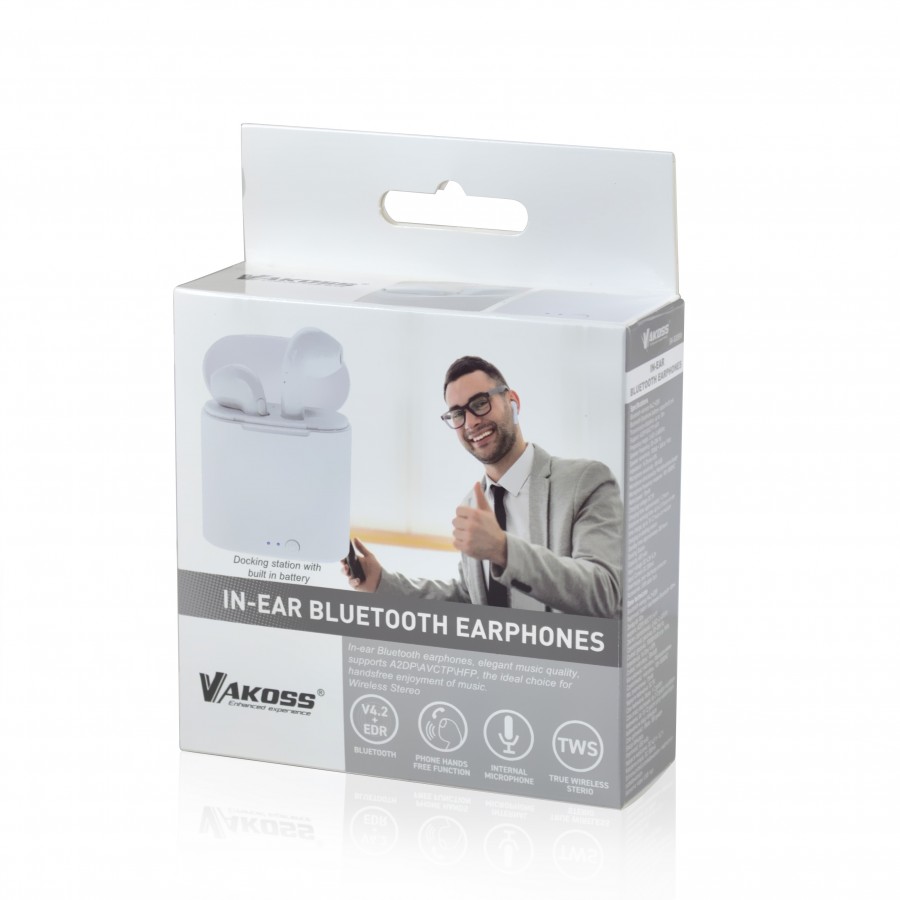 - VAKOSS® in-ear Bluetooth earphones, elegant music quality, supports A2DPAVCTPHFP, the ideal choice for handsfree enjoyment of music.